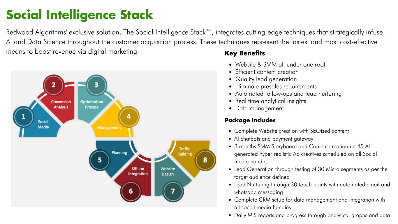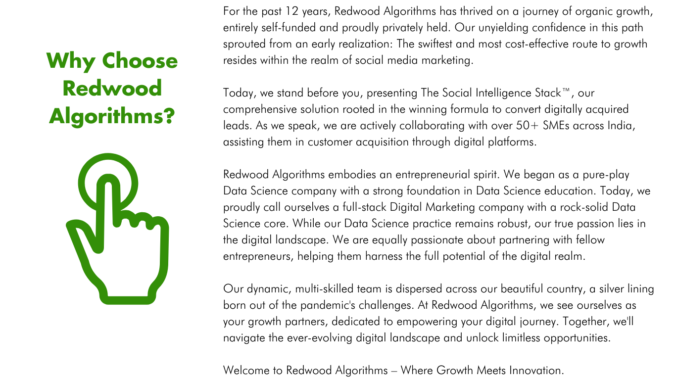Redwood Algorithms is full stack AI and Digital Marketing company with a strong Data Science foundation with multi skilled , young and dynamic team spread across the length and breadth of the country.